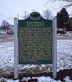 Westphalia was founded in 1836 by a group of German settlers. It was named after the province of Westphalia in Germany.[5] These settlers were German Catholics who emigrated from the Westphalian cities of Wimbach, Meerhof, and from Hesse, among others, and found the rich soil ideal for farming. Some family members stayed in Detroit, while others moved into the wilderness to clear farmland. The German-Catholic parish was established almost immediately after the settlers arrived. After buying the land at Ionia, Father Anton Kopp traveled to Detroit to visit Bishop Friedrich Reese, and returned to his assigned parish in September 1837, where he celebrated Masses in the homes of the settlers in what is now St. Mary's Parish.