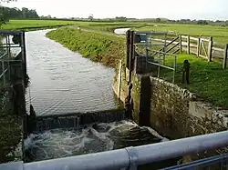 Near Hambridge, the towpath crosses back to the west bank, after which Westmoor bridge crosses. This has been lowered, and would prevent navigation. A little before the River Isle joins from the west, Middlemoor bridge carries the towpath back onto the east bank, where it remains until Midelney Bridge, another grade II listed structure,[22] which carries a minor road to Midelney Manor, a grade I listed house built on what was once an island owned by Muchelney Abbey. Much of it is sixteenth century, with some nineteenth century additions.[23] Below the bridge, the Southmoor main drain runs parallel to the channel, with the towpath sandwiched between the two on the western bank. Finally it reaches the derelict Midelney lock. Close by is Midelney pumping station, which was built in the 1960s[24] at the head of Westmoor main drain.