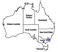 The species is found in the Australian Alps IBRA bioregion in south-eastern New South Wales and north-eastern Victoria, from Kosciuszko National Park to the vicinity of Mount Bogong, in rocky areas with snow gum woodland or alpine heath.[2][3]