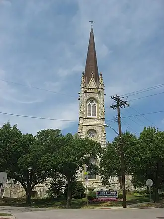 The church occupies a corner lot at the heart of the Westwood neighborhood. A clear example of the Gothic Revival style, the church is distinguished by a tall steeple crowned by a yet taller spire. The overall massing of the building is composed by its multi-gabled form and extensive fenestration, filled with stained glass, and the exterior is covered with rough-faced ashlar stonework.[3]: 6 Slates cover the roof, and elements of copper and sandstone are prominent,[1] due to the copper covering on the eight-sided spire and the large sandstone lintels surrounding the windows in the belfry and the main section of the building. Much of the building's ornamentation is also placed on the steeple, including windows with fleurs de lis and quatrefoils in their designs, and buttresses supporting the overall structure.[2]