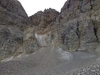 Wheeler Peak Glacier is a glacier situated at the base of Wheeler Peak within Great Basin National Park in the U.S. state of Nevada.[2] It is the only glacier in the state, and one of the southernmost glaciers in the United States.[3] At a height of 13,063 feet (3,982 m), Wheeler Peak is the tallest mountain in the Snake Range and the second tallest mountain in Nevada.[4] The mountain top is also considered to be a horn, a peak carved and shaped by glaciers over a long period of time.