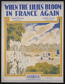 "When the Lilies Bloom in France Again" is a World War I era song released in 1918. Robert Levenson wrote the lyrics. George L. Cobb composed the music. It was published by Walter Jacobs of New York City and Boston, Massachusetts.[1] There are two versions of the sheet music cover. One was designed by Rose Starmer. The cover is described as an "artistic words only cover."[2] Another cover is a painting of a garden, with lilies in the foreground. The song was written for both voice and piano.[3]