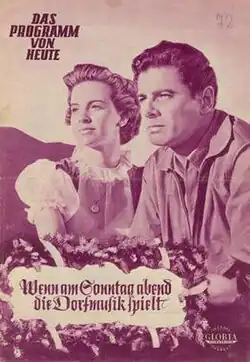 When The Village Music Plays on Sunday Nights (German: Wenn am Sonntagabend die Dorfmusik spielt) is a 1953 West German romance film directed by Rudolf Schündler and starring Rudolf Prack, Ingeborg Körner and Walter Müller.[1] It is a heimatfilm shot in Gevacolor.