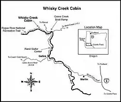 To get to the Whisky Creek Cabin from Interstate 5 take the Merlin exit north of Grants Pass, Oregon and follow the Merlin-Galice Road 23 miles (37 km) west through the towns of Merlin and Galice past the historic Rand Ranger Station to Grave Creek, where the wild and scenic section of the Rogue River begins. The Grave Creek trailhead is 4 miles (6.4 km) past the ranger station.[1][8]