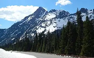 Whistler Mountain is a 7,790-foot (2,370-metre) mountain summit located in Chelan County of Washington state.[3] The mountain is part of the Okanagan Range which is a sub-range of the North Cascades. Whistler Mountain is about two miles west of Washington Pass and one mile east of Rainy Pass. The North Cascades Highway bends around the southern base of the mountain between these two passes. A high ridge connects Whistler to its nearest higher neighbor, Cutthroat Peak, which is 0.78 miles (1.26 km) to the north-northeast.[1] Precipitation runoff from the peak drains into Bridge Creek. Topographic relief is significant as the summit rises over 3,000 feet (910 meters) above the creek and highway in approximately one mile.