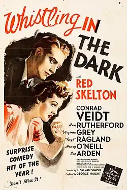 Whistling in the Dark is a 1941 American comedy film directed by S. Sylvan Simon. It is the first of three films starring Red Skelton as Wally "the Fox" Benton, who writes and acts in radio murder mysteries. Wally is kidnapped by a greedy cult leader (played by Conrad Veidt), who threatens to kill Wally's girlfriend (portrayed in all three films by Ann Rutherford) and another young woman unless he concocts a perfect murder. The film was based on the Broadway play of the same name by Laurence Gross and Edward Childs Carpenter. Uncredited contributing writer Elliott Nugent wrote and directed the earlier film adaptation of the same name.
