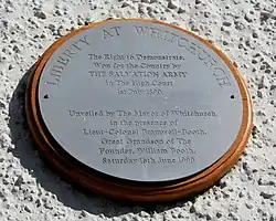 Plaque in The Square, commemorating liberty at Whitchurch won by The Salvation Army in 1890.