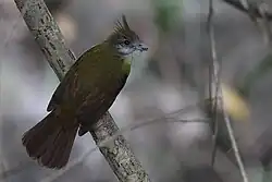 The white-throated bulbul was originally described in the genus Trichophorus (a synonym for Criniger) until moved to the genus Alophoixus in 2009.[2] Alternate names for the white-throated bulbul include the ashy-fronted bearded bulbul, ashy-fronted bulbul, white-throated bearded bulbul, and yellow-bellied bulbul. The alternate names 'ashy-fronted bulbul' and 'yellow-bellied bulbul' should not be confused with species of the same name (Pycnonotus cinereifrons and Alophoixus phaeocephalus respectively). The common name 'white-throated bulbul' is also used as an alternate name for each of the white-throated greenbul, eastern bearded greenbul, puff-throated bulbul and yellow-bellied bulbul. The alternate name 'white-throated bearded bulbul' is also used as an alternate name for the eastern bearded greenbul.