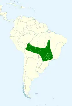 The nominate subspecies of white-wedged piculet is found in north-central and eastern Bolivia, southwestern Brazil's Mato Grosso state, northern Paraguay, and northwestern Argentina. P. a. guttifer is found in eastern and central Brazil from Pará and Maranhão south to Mato Grosso and São Paulo.[2][5] The species inhabits denser areas in moderately dry cerrado and also gallery forest. In elevation it ranges from the lowlands to as high as 2,100 m (6,900 ft).[5][6]