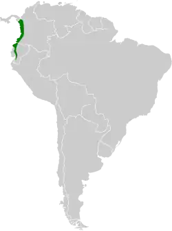 The white-whiskered hermit is found from Colombia's northern Chocó Department south through western Ecuador to El Oro Province. It has also been reported in Panama near the Colombian border. It inhabits humid mid-elevation and montane forest, humid secondary forest, dense shrublands, and plantations. In elevation it usually occurs below 1,200 m (3,900 ft) but has been recorded as high as 2,000 m (6,600 ft).[4]