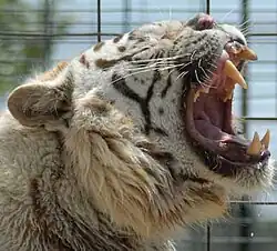 Outside of India, inbred white tigers have been prone to crossed eyes, a condition known as strabismus,[18] due to incorrectly routed visual pathways in the brains of white tigers. When stressed or confused, all white tigers cross their eyes.[19] Strabismus is associated with white tigers of mixed Bengal and Siberian ancestry. The only pure-Bengal white tiger reported to be cross-eyed was Mohini's daughter Rewati. Strabismus is directly linked to the white gene and is not a separate consequence of inbreeding.[20][21][22]
