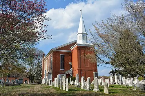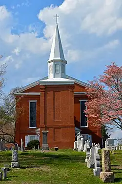 White Clay Creek Presbyterian Church is a historic Presbyterian church located near Newark, New Castle County, Delaware. The current structure was built in 1855, and is a two-story brick structure, nearly as tall (about 40 feet) as it is wide (45 feet). The building measures 63 feet deep. The exterior features brick pilasters and tall stained glass windows. A 1996 addition to the front of the building contains an elevator to the second floor sanctuary and is topped by a steeple.[2] It was preceded by a structure built in 1752. The church was organized as early as 1709 to serve Scotch-Irish Presbyterians at White Clay Creek.[3] The original White Clay Creek Presbyterian Church was built in 1721 about a mile north on the NW Corner of Dewalt Rd and Old Coach Rd.