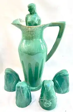White Cloud Farms pottery also produced a Bottoms Up martini pitcher until the late 1930s. It was cylindrical and its lid was in the form of the top half of the naked flapper.[10]