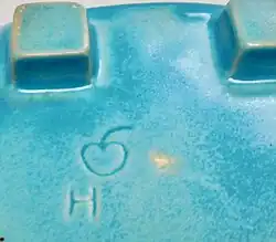 White Cloud Farms Pottery mark: incised apple. Here an "H" is added as a signature of Holland Robert Bacher. (1930s)