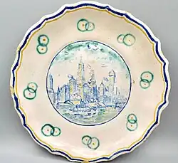 White Cloud Farms Pottery: Plate depicting NYC cityscape. handpainted. (1930s)