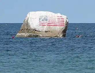 At the northern end of the beach is a rock protruding from the water with an American flag painted on. According to local lore, this act of patriotism was performed to cover a Nazi swastika painted on the rock. In the summer of 1941, local teenagers painted the first flag and went on to join the armed forces after Pearl Harbor was attacked in December of that year.  The harsh winter storms washed the flag thin, so the swastika showed through.  The next Fourth of July, the tradition of re-painting the flag was born.