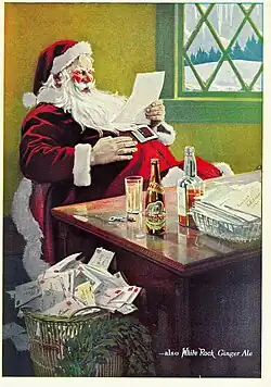 Coca-Cola is frequently credited with the "invention" of the modern image of Santa Claus as an old man in red-and-white garments;[2] however, White Rock predated Coca-Cola's usage of Santa in advertisements for soft drinks. In 1923, the company used Santa to advertise its ginger ale after first using him to sell mineral water in 1915.[3][4]