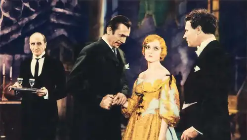 Colored publicity shot for White Zombie, featuring Brandon Hurst, Bela Lugosi, Madge Bellamy, and John Harron.