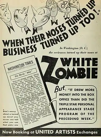 White Zombie ad from The Film Daily, 1932 mentions the critics' negative reviews, but great box office ticket sales.