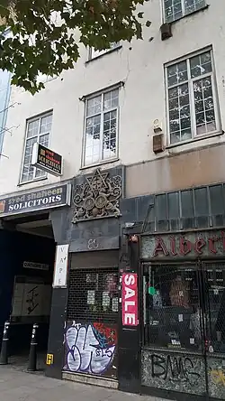 88 Whitechapel High Street – a 4-storey 3-bay shop and office, built in 1838, in stuccoed stock brick. The building steps over the entrance to Gunthorpe Street. It has been occupied by the menswear shop Alberts since 1942.[44] The Grade II listed metal relief above the door by Arthur Szyk depicts a Star of David supported by two Lions of Judah wielding sabres, and was commissioned by the Jewish Daily Post, which occupied the building in 1934–35.[45]