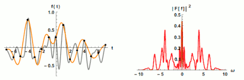 In the figure on the left, the gray curve shows a function f(t) in the time domain that is sampled (the black dots) at steadily increasing sample-rates and reconstructed to produce the gold curve. In the figure on the right, the red curve shows the frequency spectrum of the original function f(t), which does not change. The highest frequency in the spectrum is half the width of the entire spectrum. The steadily-increasing pink shading represents the reconstructed function's frequency spectrum, which gradually fills up more of the original function's frequency spectrum as the sampling-rate increases. When the reconstructed function's frequency spectrum encompasses the original function's entire frequency spectrum, it is twice as wide as the highest frequency, and that is when the reconstructed waveform matches the sampled one.