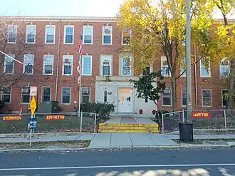 Following a Congressional appropriation to build a school, the assistant superintendent visited several potential sites.[13] A plan was developed to build an eight-room school at Fifth and Sheridan Streets, but the neighborhood association wanted a portable school opened until the permanent school was scheduled to be opened in 1926.[14] The association also advocated for a sixteen-room school instead.[14] The supervising principal of the area opposed the idea of a temporary portable school, saying that would result in 83 children from grades one through eight being taught in just one room.[15] The association then refocused their efforts, requesting the renting of an eight-room building to be used as a temporary school.[16] With support from the Takoma Park Citizen's Association,[17] a temporary portable school was approved.[18] After the school board removed funding to construct a permanent school from its budget,[19] the Manor Park Citizens Association petitioned Congress to provide for a school with room for expansion.[20]