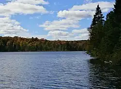 Its maximum approximate depth is 2 metres (6 ft 7 in), its width is 750 meters (2,460 ft) and its length is 1.5 kilometres (0.93 mi).[1] Even if the lake is located only a few kilometers from Lake Mégantic and Lake Mckenzie, its outlet flows into the neighboring watershed as far as Grand lac Saint-François, source of the Saint-François River.[2]