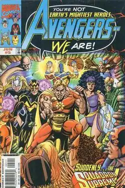 ![]() The Whizzer (in black and yellow) appears with the Squadron Supreme on the cover of Avengers vol. 3, #5 (June 1998). Art by George Pérez. | |
