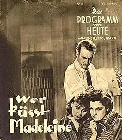 Who's Kissing Madeleine? (German: Wer küßt Madeleine?) is a 1939 German comedy film directed by Victor Janson and starring Magda Schneider, Albert Matterstock and Herti Kirchner.[1] The film's sets were designed by the art director Willy Schiller. Location shooting took place at Rangsdorf near Berlin.