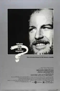 Whose Life Is It Anyway? is a 1981 American drama film directed by John Badham and starring Richard Dreyfuss. It was adapted by Brian Clark and Reginald Rose from Clark's 1972 television movie and 1978 stage play, all under the same title. Whose Life Is It Anyway? received a 70% fresh rating on Rotten Tomatoes, based on 10 reviews and an average rating of 6.58/10.[2]