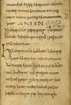 The first seventeen lines of the "Wið færstice" have been referred to as its "epic introduction".[1] Howell D. Chickering Junior expressed the view that there "probably is no epic or mythic narrative" behind this introductory section, instead arguing that it should be seen as "a dramatic verbal performance".[2] As edited and translated by Alaric Hall, the text runs: