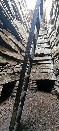 The chambered cairn is located near Kirkwall on Mainland, Orkney in Scotland. The monument is situated on a steep west facing hill northwest of Wideford Hill and faces the Bays of Firth and Kirkwall.[1] It is similar in design to the Maeshowe burial monument, also located on Mainland, Orkney. The visible masonry shows the different construction stages of the Neolithic cairn with its three concentric walls built on an earthen platform. The monument has a stepped facade, but the original shape was probably rounded or conical, with the stonework covered in clay and turf.[1][2]