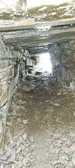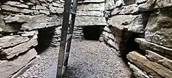 The inner passage, which is cut into the hill, is covered with lintel slabs and leads to a rectangular stone-lined chamber and three side chambers.[2] The side chambers are corbelled.[1] Entry to the tomb now is through a reconstructed concrete roof, completed during the 20th century.[3]