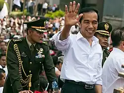 Two years later, Joko Widodo was elected as Indonesia's seventh president in the 2014 Indonesian presidential election. Several days prior to his inauguration, Joko Widodo picked Widi as his aide-de-camp from the army. Widi appeared on the podium alongside the aide-de-camp from the air force Mohamad Tony Harjono during Joko Widodo's inaugural speech on 20 October 2014.[9][10][11] Widi was reposted from his position as aide-de-camp to become the commander of the Siliwangi (West Java) military command training regiment in early 2016.[12] He left the position on 6 July 2017.[13]