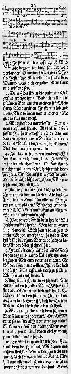 - ^ Johann Crüger (1653). "Wie soll ich dich empfangen". Praxis pietatis melica (in German) (5th ed.). Berlin: Christoff Runge. pp. 156–158 – via Munich Digitization Center.