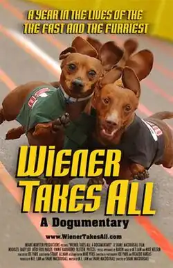 Wiener Takes All: A Dogumentary is a 2007 documentary film that chronicles the lives of America's top competitive dachshunds and their owners. Directed by Shane MacDougall, the film follows five competitors in the Wienerschnitzel "Wiener Nationals" dachshund racing circuit, from the scandal of the 2003 Wiener Nationals, through to the 2005 championships this December in San Diego.[1] The film opens with Noodles' controversial 2003 loss, and the ensuing Noodles-Pretzel rivalry - one that is cut short with Pretzel's tragic sudden death. Only a few weeks later Noodles triumphantly wins the 2004 Wiener Nationals - this time free and clear. The glory is short-lived, as he is forced into retirement by race organizers, and Team Noodles has to decide whether to accept his premature sojourn from the sport, or try and qualify out of state.