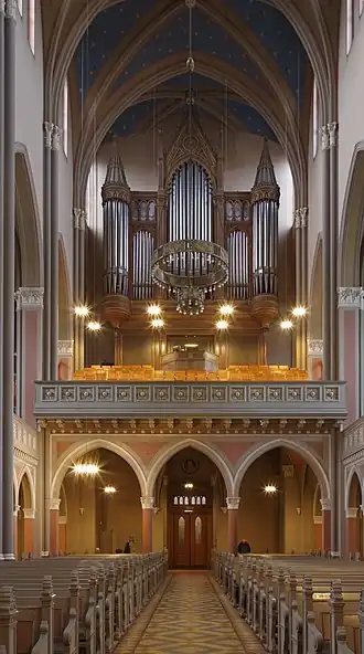 Concerts and other events are held every two years around November.[1] Each festival has a motto, and events include lectures, chamber music, organ concerts and the organ competition, and large choral concerts. The events are held mostly in Wiesbaden churches, such as the Marktkirche, Lutherkirche, St. Bonifatius and Bergkirche. They have been performed by both local groups and international artists.[4][5] The motto in 2015 was "Vom Himmel auf Erden" (Of Heaven on Earth), with Fauré's Requiem sung by a festival choir conducted by Andreas Großmann at St. Bonifatius, Dvořák's Requiem at the Marktkirche, and Elgar's The Dream of Gerontius at the Lutherkirche.[6]