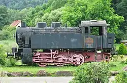 From 1921 to 1930, the narrow-gauge Wasgauwaldbahn line to Ludwigswinkel began here, the tracks of which were located to the west of the standard-gauge line.[51] After the closure of passenger services, the Deutsche Bundesbahn planned to demolish all the buildings at the beginning of the 1970s. However, on the initiative of two entrepreneurs from the region, the association Fördergemeinschaft Wasgau e. V. was formed in 1972 to prevent these measures. While the goods shed was removed before the association was founded, the station building was saved. In the same year, the association acquired a Dillinger Hütte works locomotive built by Škoda in 1941, which stands as a monument on the station forecourt.[57]