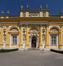 Wilanów Palace was built for King John III Sobieski in the last quarter of the 17th century and later was enlarged by other owners.[4] It represents the characteristic type of Baroque suburban residence built entre cour et jardin (between the entrance court and the garden). Its architecture is original, a merger of generally European art with distinctively Polish building traditions.[4] Upon its elevations and in the palace interiors ancient symbols glorify the Sobieski family, especially the military triumphs of the king.[5]