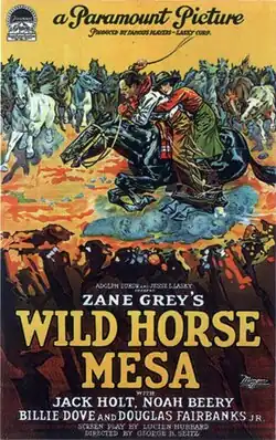 Wild Horse Mesa is a 1925 American silent Western film directed by George B. Seitz and starring Jack Holt, Noah Beery Sr., Billie Dove, and Douglas Fairbanks Jr.[1][2] Based on the novel Wild Horse Mesa by Zane Grey, the film is about a rancher who, desperate for money, decides to trap and sell wild horses using barbed wire. The local Navajo tribe tries to persuade him not to do it. The film was produced by Famous Players–Lasky and released by Paramount Pictures. Several prints of the film have survived.[3][4]