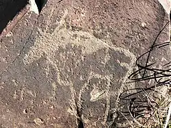 The pecked engravings of the area are estimated to span a period from perhaps a few hundred to possibly several thousand years ago.[14] Direct cation ratio dating methods applied at Klipfontein,[15] giving estimates spanning the entire Holocene, hinge, however, on a calibration curve of uncertain reliability, and the samples were too small to run more than one assay each.[16] Hairline engravings, known from a few sites in this area and more commonly in the Karoo, are consistently beneath pecked engravings in superimposed sequences, and are thus older. Butzer used geomorphological evidence to infer bracketing ages for the engravings at Bushmans Fountain and Driekopseiland,[17] with the resulting scenario being in broad accord with more recent work on palaeoenvironmental change at a regional scale, as well as with findings at other sites, and observations of associated archaeological material.[18] At Wildebeest Kuil some of the engravings were undoubtedly made by Later Stone Age occupants of the site 1200–1800 years ago, as suggested by the radiocarbon readings cited below.