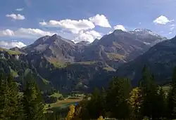 The Wildhorn is a mountain of the Alps, straddling the border between the Swiss cantons of Bern and Valais. At 3,250 metres (10,663 ft) above sea level, it is the highest summit of the Bernese Alps west of the Gemmi Pass. It forms a large glaciated massif, about 10 km wide, extending between the Sanetsch Pass and the Rawil Pass. Along with the Muverans, the Diablerets and the Wildstrubel, the Wildhorn is one of the four distinct mountain massifs of the Bernese Alps that lie west of the Gemmi Pass. The massif of the Wildhorn is at the centre between the valleys of the Saane, Simme (both canton of Bern) and the Rhone (Valais).[3] It comprises several distinct summits, including (from west to east) the Arpelistock, Le Sérac, the Geltenhorn, the Sex Noir, the Sex Rouge, the Schnidehorn and the Six des Eaux Froides. The main crest is between the glaciers named Tungelgletscher and Glacier du Wildhorn. South of the main summit is the almost equally high summit of Mont Pucel (3,177 m). The Wildhorn is surrounded by several large mountain lakes: the Lac de Sénin, the Lauenensee, the Iffigsee, the Lac de Tseuzier and the Lac des Audannes. The Tungelgletscher, on the north-east face, was measured as 1.9 km in length in 1973.[4]