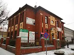 - Former parish house at 2 Kiliński Street – built after 1911 in a semi-modernist style.[19] A freestanding,[20] two-story building[19] made of red brick with plastered decorative elements. The front façade features a rectangular avant-corps, while the rear façade has two visible avant-corps.[20]