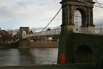 Wilford Suspension Bridge, also known as Meadows Suspension Bridge,[2] was originally known as the Welbeck Suspension Bridge. It is a combined suspension footbridge[1] for pedestrians and cyclists, and aqueduct which crosses the River Trent, linking the town of West Bridgford to the Meadows, in the city of Nottingham, England.[1] It also carries a gas main.