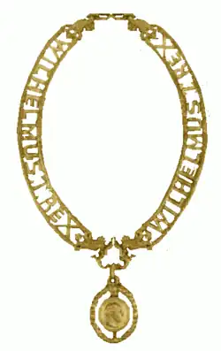The insignia of the Order consisted of a golden medal with the portrait of William I, surrounded by a golden wreath and suspended from a heavy golden collar. This collar with a weight of 222 grams bore the words WIRKE IM ANDENKEN AN KAISER WILHELM DEN GROSSEN (English: "Work in the memory of Emperor William the Great") and was designed by the jewellers Emil Weigand and Otto Schultz.