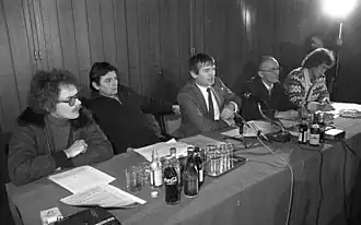 Knabe left East Germany in 1959, with his pregnant wife and three children.[2] The family settled in North Rhine-Westphalia, West Germany,[5] where he joined the Christian Democratic Union, as it represented his Christian ethics. He left the party in 1966 because he could no longer support its belief in unrestrained economic growth, building of highways, and support of nuclear energy.[6] Knabe worked from the mid-1960s in a leading position for the Landesanstalt für Ökologie, a state agency for ecology, in Recklinghausen,[5] moving to Mülheim in 1967.[7] He headed a project developing strategies to fight Waldsterben (death of the forests).[8] In the 1970s, he supported oppositional groups in the GDR, such as ecological groups, initiatives for international development, and especially the Umwelt-Bibliothek (ecological library) in Berlin and the Ökologischer Arbeitskreis (ecological work group) in Dresden.[7]