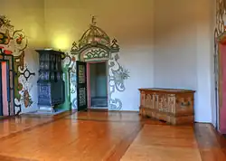 The palace is a four-winged structure with a nearly square floor plan. The comprehensive facilities include an outdoor parade grounds, a gatekeeper's house, pleasure gardens, a kitchen garden, a prison tower, stables, a bakery and a brewery. The spatial arrangement is typical for a residential palace. The halls were decorated with scrollwork and strapwork and adorned with decorative paintings, including a copy of the Iwein epos by Hartmann von Aue the basement.