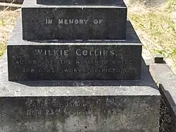 Collins died on 23 September 1889, at 65 Wimpole Street, following a paralytic stroke. He is buried in Kensal Green Cemetery, West London. His headstone describes him as the author of The Woman in White.[20] Caroline Graves died in 1895 and was buried with Collins. Martha Rudd died in 1919.[3]