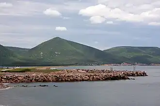 Wilkie Sugar Loaf has been the official name for this mountain since April 21, 1936.[5] The mountain's name is a combination of both "Wilkie," the family name of a pioneer family in who settled in the area in 1820,[7] James Wilkie Jr. was an original land grant recipient in the area in 1852,[8] and "Sugar Loaf", a descriptive name for the mountain's distinct pyramidal shape, which suggests a "sugarloaf". The name Wilkie Sugar Loaf was already in common use in official publications such as Admiralty Charts[9] and Sailing Directions by 1860.[10] The Mi'kmaq name for the mountain was "Squa-dichk," meaning "the highest point."[8][4]