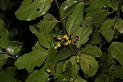 Wilkiea longipes is a shrub or small tree that typically grows to a height of 0.75–15 m (2 ft 6 in – 49 ft 3 in). Its leaves are elliptic to egg-shaped with the narrower end towards the base, 85–260 mm (3.3–10.2 in) long and 40–120 mm (1.6–4.7 in) wide on a petiole 8–20 mm (0.31–0.79 in) long. The leaves have scalloped edges and the midvein is prominent on the lower surface. Male and female flowers are borne on separate plants. Male flowers are borne in leaf axils, sometimes on woody branches, in clusters of 5 to 11, up to 8.5 mm (0.33 in) long, each flower club-shaped to spherical 2–3 mm (0.079–0.118 in) long with 4 pairs of tepals, on a pedicel 15–20 mm (0.59–0.79 in) long with 3 or 4 pairs of stamens. Female flowers are borne in leaf axils in groups of 3, mostly 3.0–4.5 mm (0.12–0.18 in) long, each flower more or less spherical, about 4 mm (0.16 in) in diameter on a pedicel 15–18 mm (0.59–0.71 in) long, with 9 to 13 carpels. Flowering occurs from November to May, and the fruit is a spherical to oval, black or dark blue drupe 12–16 mm (0.47–0.63 in) long and 10–13 mm (0.39–0.51 in) wide.[2]